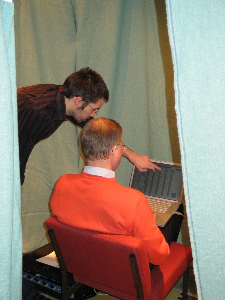 In addition to the seminar debates, the group always take the opportunity to carry out their own aural assessments on the tests that are being conducted within the project. Here you see Soren Bech undergoing instruction on how the interface for the indirect envelopment tests should be operated.