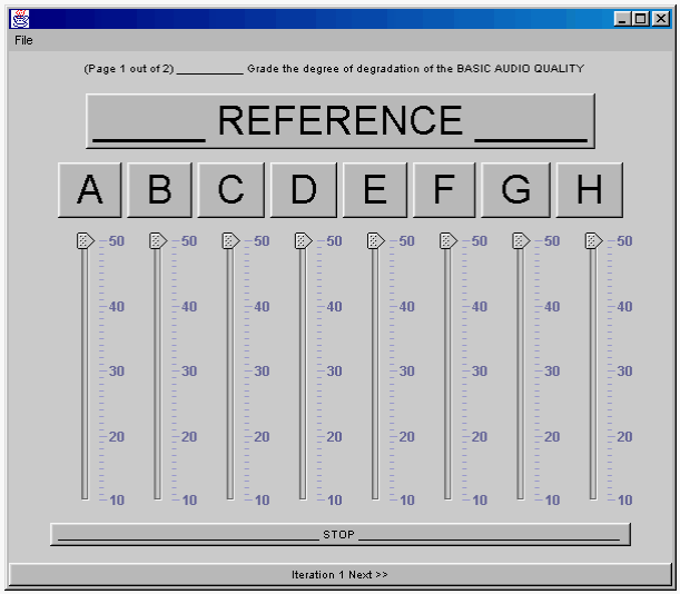 Typical user interface used during listening testsIt was decided to use a double-blind multi-stimulus test method with hidden reference and hidden anchors (MUSHRA) as a basis for experimental design. The main reason of this choice was suitability for assessment of medium and large impairments (the quality of most of processed items used in experiments was degraded quite considerably). Moreover, MUSHRA test allows for quick comparison and assessment of large number of stimuli which is beneficial in terms of duration of a listening test.